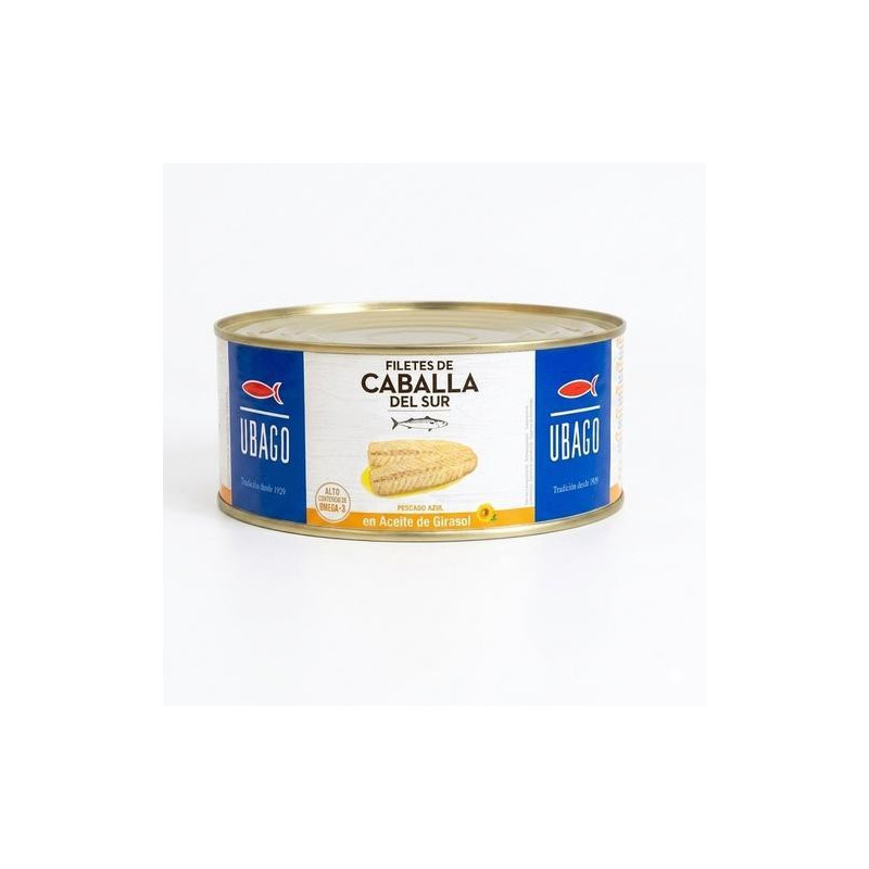 Filete de caballa del sur en aceite de girasol UBAGO de 950 gramos, pescado azul rico en omega 3, elaborado artesanalmente y envasado en lata de conserva, perfecto para ensaladas, tapas o como plato principal.
